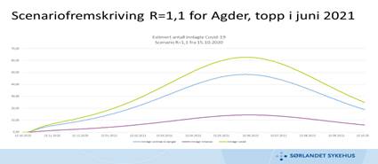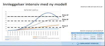 [1] Ved R-tall på 1.1 vil vi nå trinn 2 våren 2021, ved R-tall 1.2 vil vi komme i trinn 2 den 24.02.20, ved R-tall 1.3 vil vi komme i trinn 2 den 27.12.20 mens vi ved R-tall 1.4 vil komme i trinn 2 allerede 13.12.20 og ha en topp 2-3 mnd senere som langt overskrider SSHF sin intensivkapasitet.